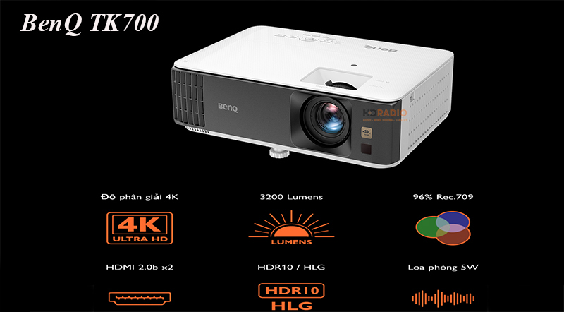 BenQ TK700 tích hợp 1 loa 5W duy nhất được cung cấp bởi CinemaMaster Audio + 2 độc đáo của BenQ, được tích hợp bên trong khung máy nhỏ gọn và tạo ra âm thanh tuyệt vời. Âm thanh 5W tích hợp mạnh mẽ này mang đến trải nghiệm nghe nhìn hấp dẫn với các chế độ Rạp chiếu phim, Âm nhạc, Thể thao và Trò chơi riêng biệt.