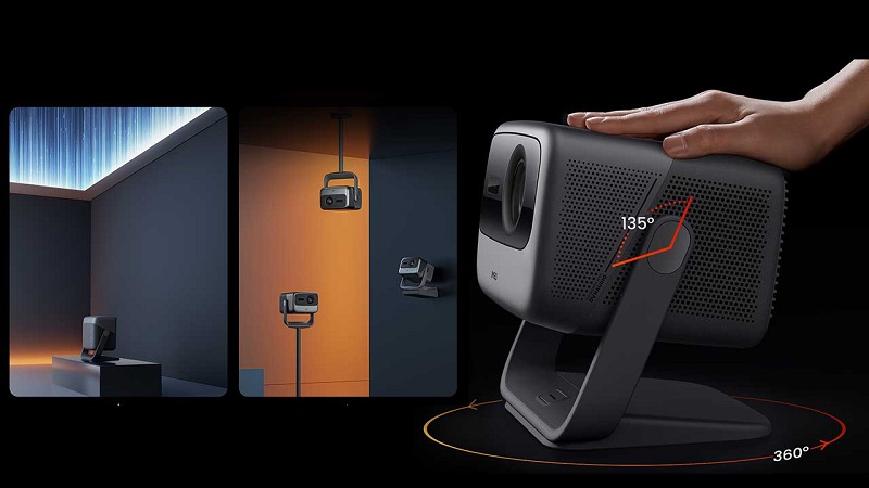 Đặc biệt máy chiếu còn đi kèm với 1 chân xoay gimbal cho phép bạn dễ đàng căn chỉnh góc chiếu thật nhẹ nhàng chỉ với 1 tay. Chân gimbal có khả năng xoay 360 độ theo chiều ngang, hoặc lên xuống 135 độ. Chân đế máy chiếu đã trải qua tới 100.000 bài test độ bền, đảm bảo sự chắc chắn và bền bỉ lâu dài.