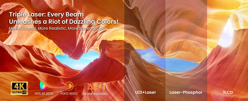 Công nghệ laser 3 màu trên JMGO N1S Infinity 4k sử dụng 3 laser RBG thay vì sử dụng đĩa màu, mang đến khả năng trình chiếu hình ảnh với độ sáng cao, màu sắc rực rỡ, vượt trội so với các công nghệ chiếu sáng trước đây.