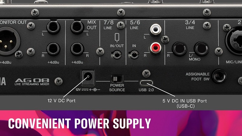Mixer AG08 được trang bị hai kênh đầu vào combo XLR/TRS hỗ trợ nguồn phantom 48V, lý tưởng cho việc sử dụng đồng thời hai micro condenser.