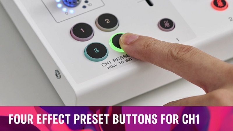 Ở góc dưới bên trái của AG08 tích hợp bốn nút bấm "Effect Preset" - những nút "cài đặt sẵn hiệu ứng" đặc biệt dành riêng cho Kênh 1 (thường dùng cho micro). Bạn có thể tùy chỉnh các hiệu ứng ưa thích của mình (bao gồm cả hiệu ứng thay đổi giọng nói "Voice Changer") và lưu chúng vào bốn nút này.