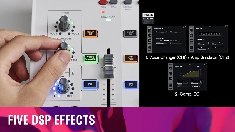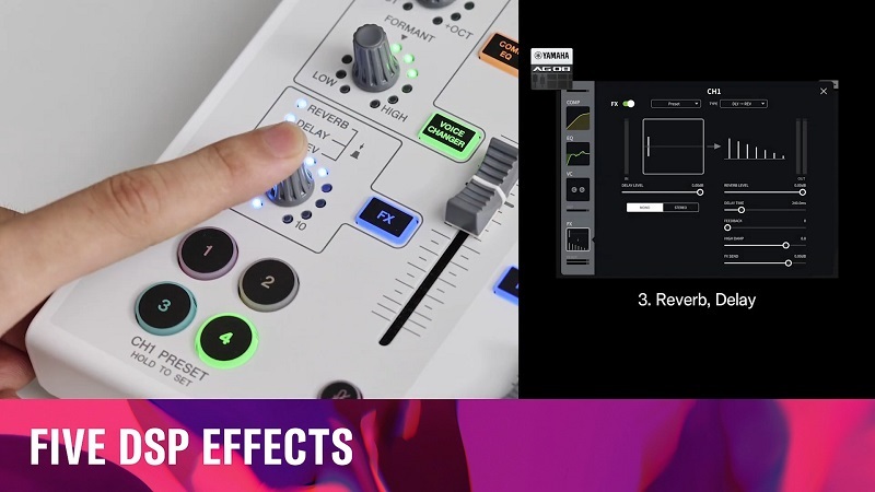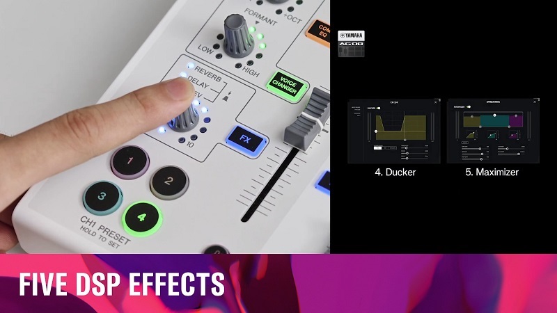 Mixer AG08 tích hợp sẵn bộ xử lý hiệu ứng kỹ thuật số (DSP) chất lượng cao từ Yamaha, giúp bạn dễ dàng làm đẹp, chỉnh sửa hoặc tăng cường âm thanh cho giọng hát và nhạc cụ của mình.