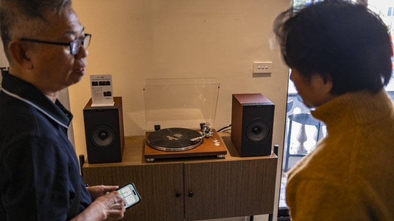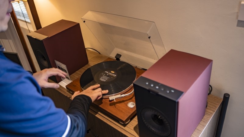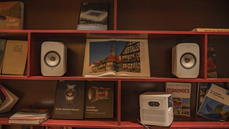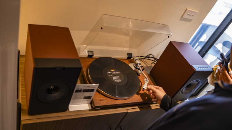 Hệ thống trình diễn gồm loa KEF Coda W, amply streaming NAD M10 V3 và mâm than cùng bộ sưu tập vinyl chọn lọc.