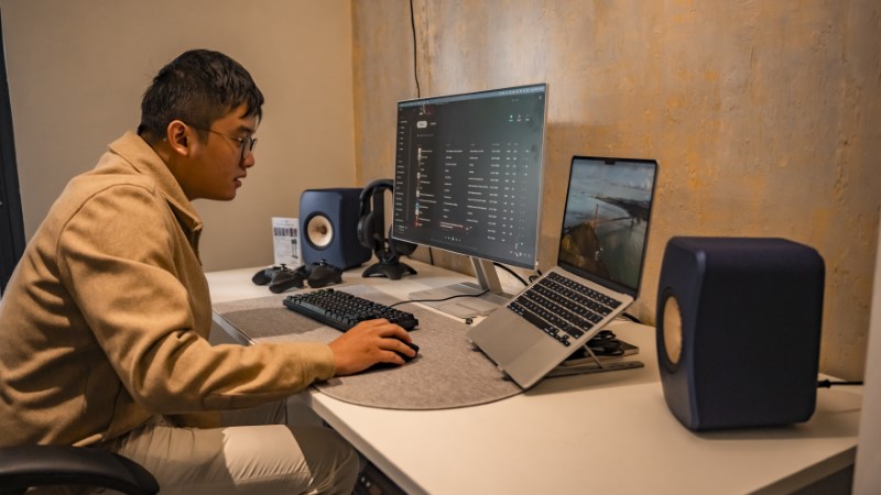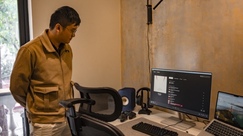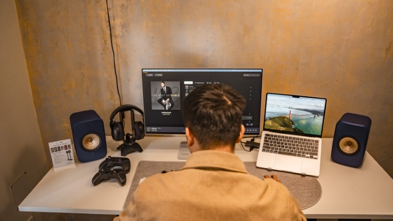 Không gian thứ hai mang phong cách tối giản, hiện đại, dành cho nhu cầu làm việc, học tập và giải trí cá nhân. Setup nổi bật với loa KEF LSX II, PC cấu hình cao và tai nghe gaming Turtle Beach.