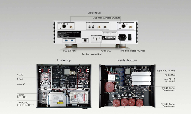 Những đặc trưng giúp A30 đứng ở đẳng cấp riêng của mình chính là một loạt trang bị thường ít thấy trên một music server. Những tính năng như rip CD, mạch headphone amplifier, bộ nhớ trong dung lượng 10TB, màn hiển thị màu LCD siêu rộng và phần mềm tích hợp cho phép biên tập metadata và công cụ quản lý thư viện nhạc số. Tất cả, và hơn thế nữa, những tính năng giúp nâng tầm trình diễn của Aurender A30 lên một chuẩn mới cho thiết bị nguồn phát nhạc số tất cả trong một.