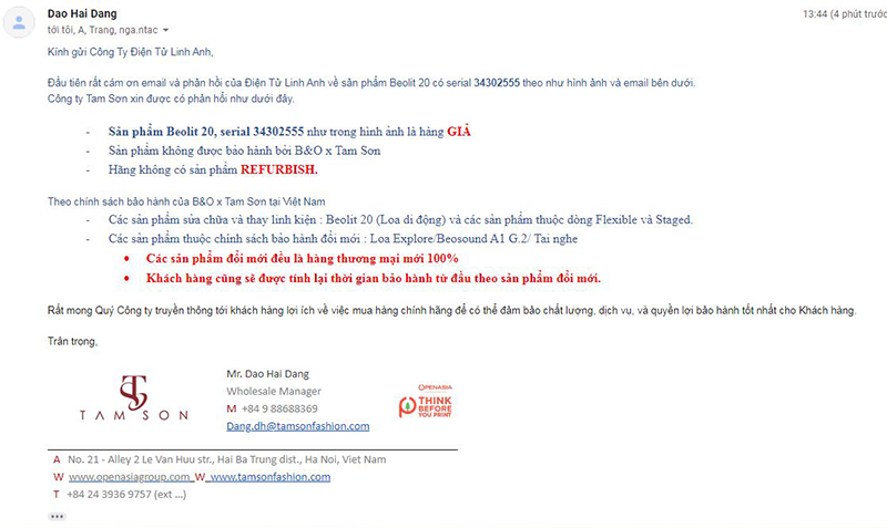 Khi tìm mua loa Beolit 20, chắc hẳn các bạn sẽ bắt gặp rất nhiều bài đăng bán loa hàng Refurbish với giá rẻ bất ngờ, để làm rõ vấn đề này, Điện tử Linh Anh đã gửi Email lên Tam Sơn – một đơn vị phân phối sản phẩm chính hãng của B&O và đã nhận được câu trả lời.