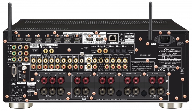 Khi nói đến cấu hình loa, Amply xem phim Pioneer SC-LX901 mang đến sự linh hoạt vô song trong phạm vi của Người tiên phong. Đối với hệ thống Dolby Atmos, Pioneer cho phép bạn định cấu hình bốn loa hỗ trợ âm trần hoặc Atmos cũng như âm thanh vòm 7 kênh đầy đủ. Ngoài ra, sử dụng hai loa Atmos và thưởng thức âm trường rộng với `loa rộng phía trước` tạo thành một hệ thống 9.2.2. Nếu bạn không thích một hệ thống cụ thể của Dolby Atmos nhưng muốn có âm thanh sống động nhất có thể, hãy chọn cấu hình 11.2. Điều này cung cấp âm thanh 7,2 với việc bổ sung loa chiều rộng phía trước và chiều cao phía trước.