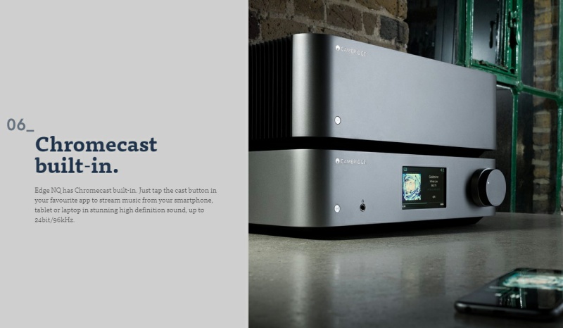 Edge NQ tích hợp Chromecast, các File nhạc độ phân giải cao 24Bit / 96K từ máy tính, điện thoại thông minh chỉ cần 1 thao tác là được chuyển đến Edge NQ mà chất lượng File không hề bị suy giảm âm thanh được thể hiện rõ nét tuyệt vời.