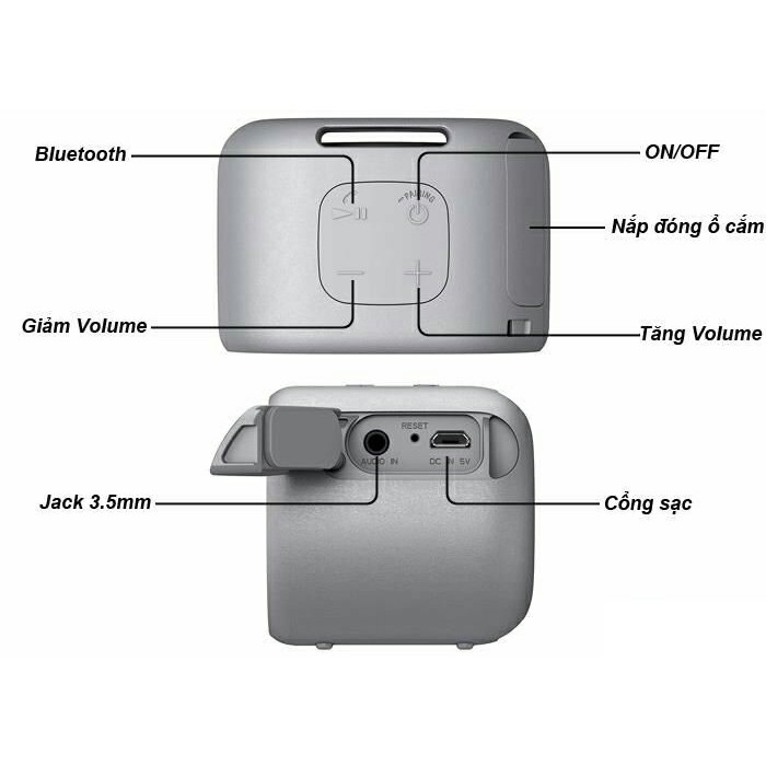 Trên thân loa có 4 nút điều khiển cơ bản là tắt bật, dừng phát nhạc và 2 phím điều khiển âm lượng. Đối diện với mặt đặt cụm phím điều khiển là 2 miếng cao su đặt song song, đây sẽ là 2 chân chống rung cho loa khi đặt trên mặt bàn.