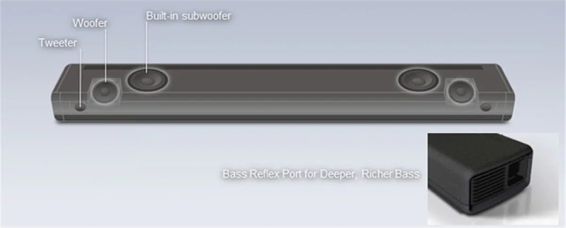 Loa được trang bị đến 2 loa subwoofer gắn trong cùng hai màng cộng hưởng tiếng trầm. Thiết kế này giúp loa có thể phát ra được âm trầm hết sức chắc chắn nhưng cũng không kém phần sâu lắng và ngọt ngào. Ngoài ra, loa còn được trang bị loa tweeter (cho âm bổng) giúp cho thiết bị có khả năng cân bằng âm thanh một cách hoàn hảo, giúp khách hàng có thể trải nghiệm âm thanh vòm đầy sắc nét.