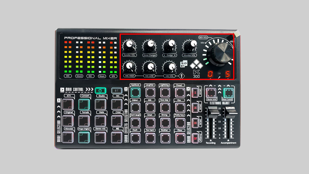 Phía trên là các núm xoay có chức năng điều chỉnh âm lượng của mic hoặc của các hiệu ứng có sẵn của SoundCard k300.