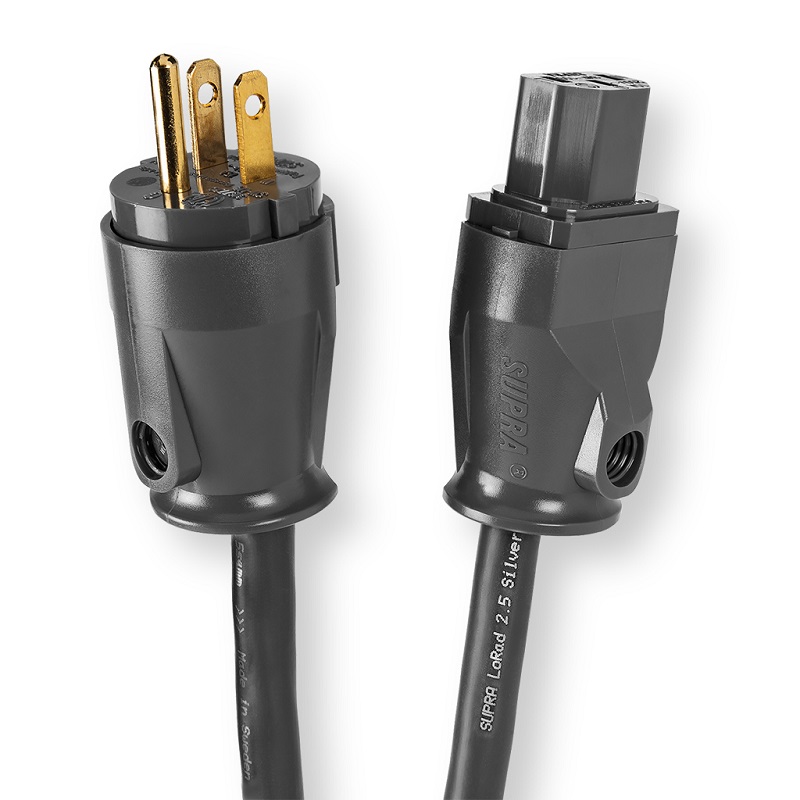 Bộ dây được bảo vệ, mạ bạc bao gồm cáp Supra LoRad SPC 3 x 2,5 mm2, đầu nối cái Supra SWF10 (IEC-320) và phích cắm đực Supra SW-US. Tiêu chuẩn Hoa Kỳ / Canada. Phù hợp với các khối phân phối điện lưới LoRad Tiêu chuẩn Hoa Kỳ được xếp hạng 15 Ampe.