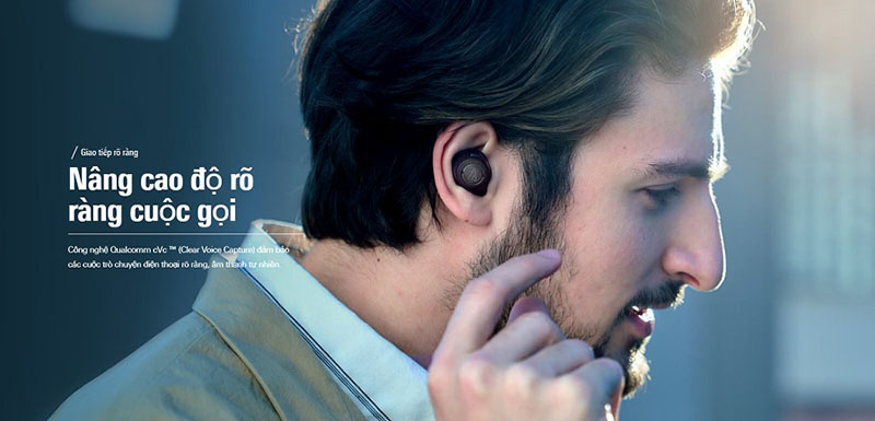 Tai nghe cũng được tích hợp micro đàm thoại khử ồn với công nghệ Qualcomm cVc - Clear Voice Capture được đặt vuông góc với củ loa để tối ưu hóa không gian xung quanh và đem tới cuộc trò chuyện điện thoại rõ ràng, tự nhiên.
