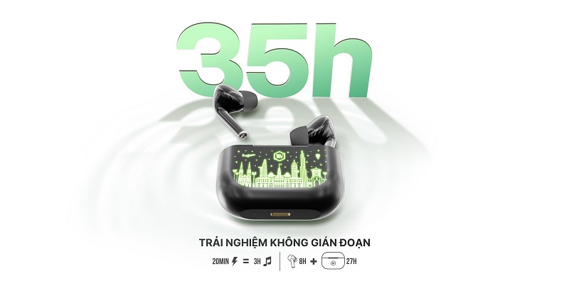 Đặc biệt, với tính năng sạc nhanh, chỉ cần 20 phút sạc, bạn đã có ngay 3 giờ nghe nhạc liên tục. Đây là một ưu điểm vượt trội, phù hợp với những người bận rộn hoặc thường xuyên di chuyển.